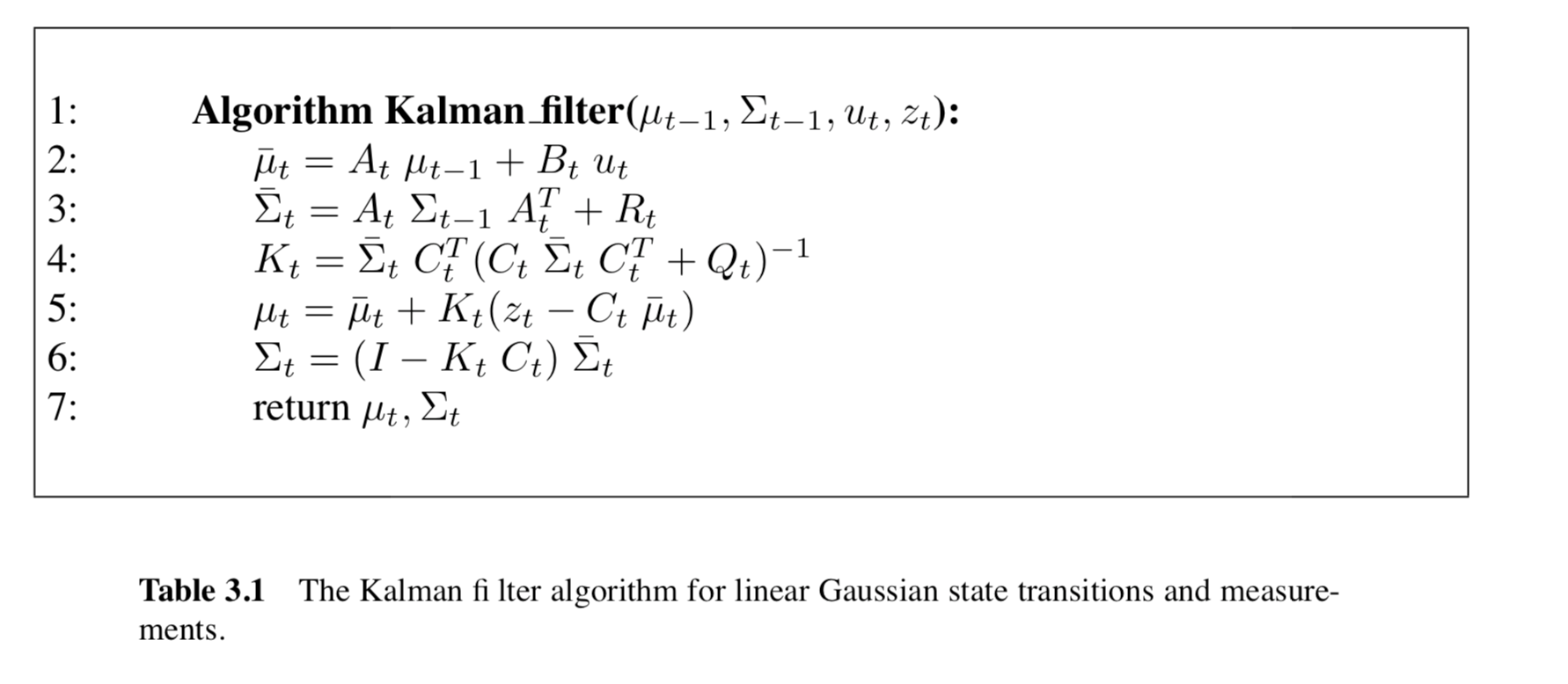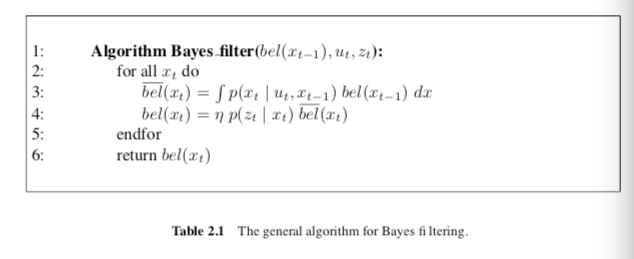 The algorithm generally becomes a matter of recursively updating it's state belief based on new control data u and measurement data z: