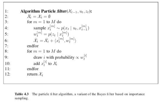 The major trick in implementing particle filters is how we perform the sampling in lines 8-11. When we retake samples to approximate the posterior, we draw samples with replacement according to an importance weight. Since the weight corresponds to the posterior probability, particles with a higher probability are more likely to be drawn. After enough iterations, the N samples we take should approximate the posterior.