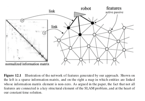 There are various approaches to solving SLAM, such as using Kalman Filters or other Information Filters. Constraints on the robots measurements of landmarks and its current state is represented by an information matrix: