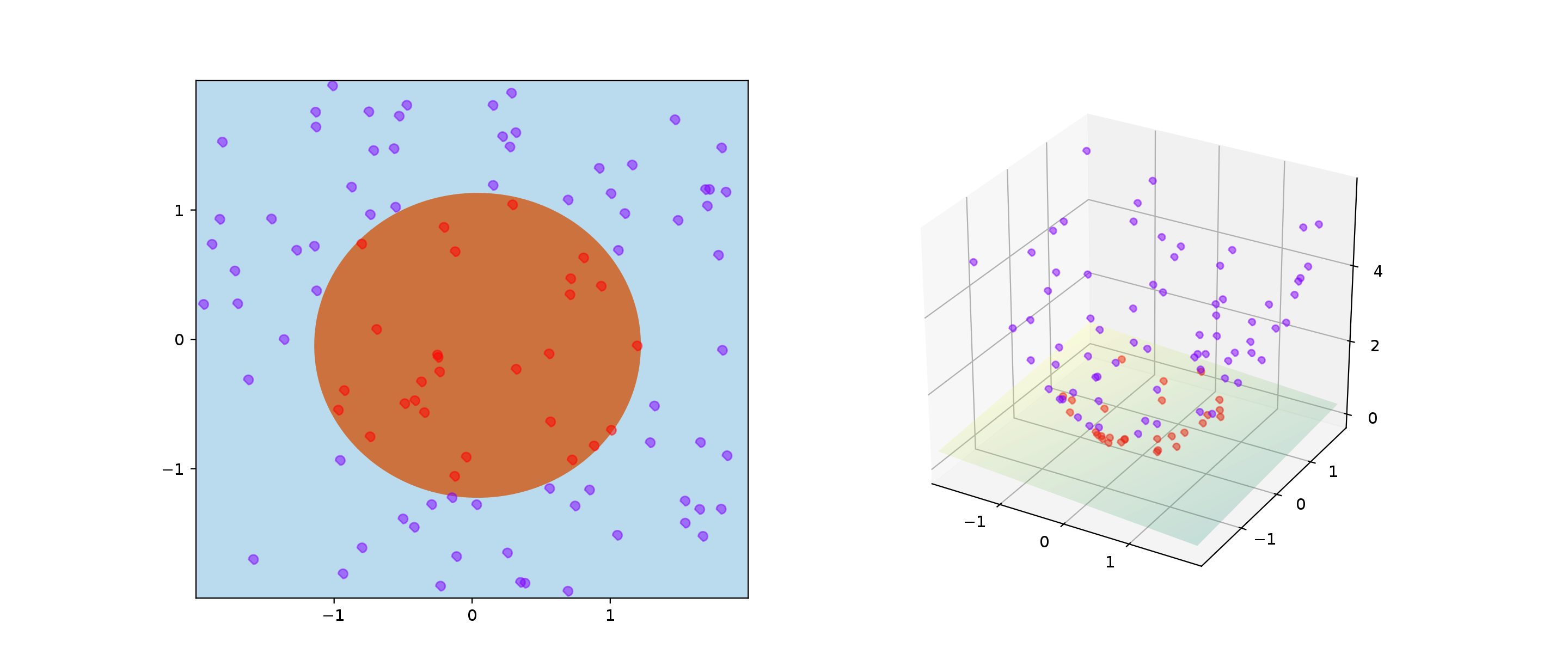 How do you separate non-linearly separable data with only linear separators? You map it to a higher dimensional space where you can separate them!