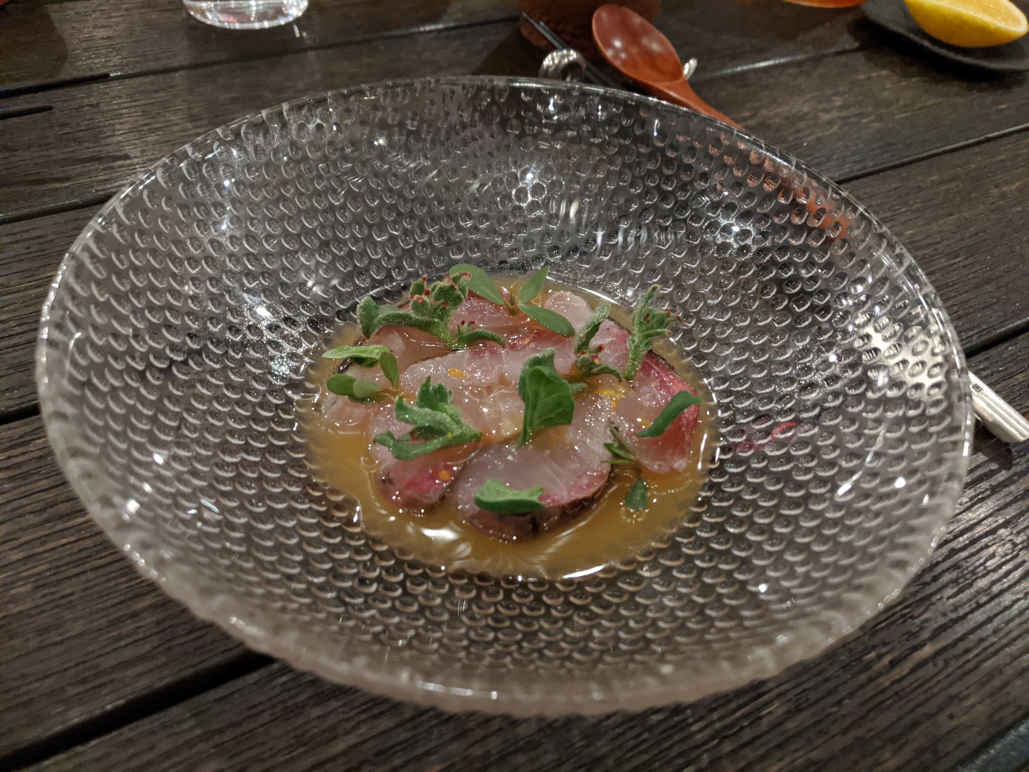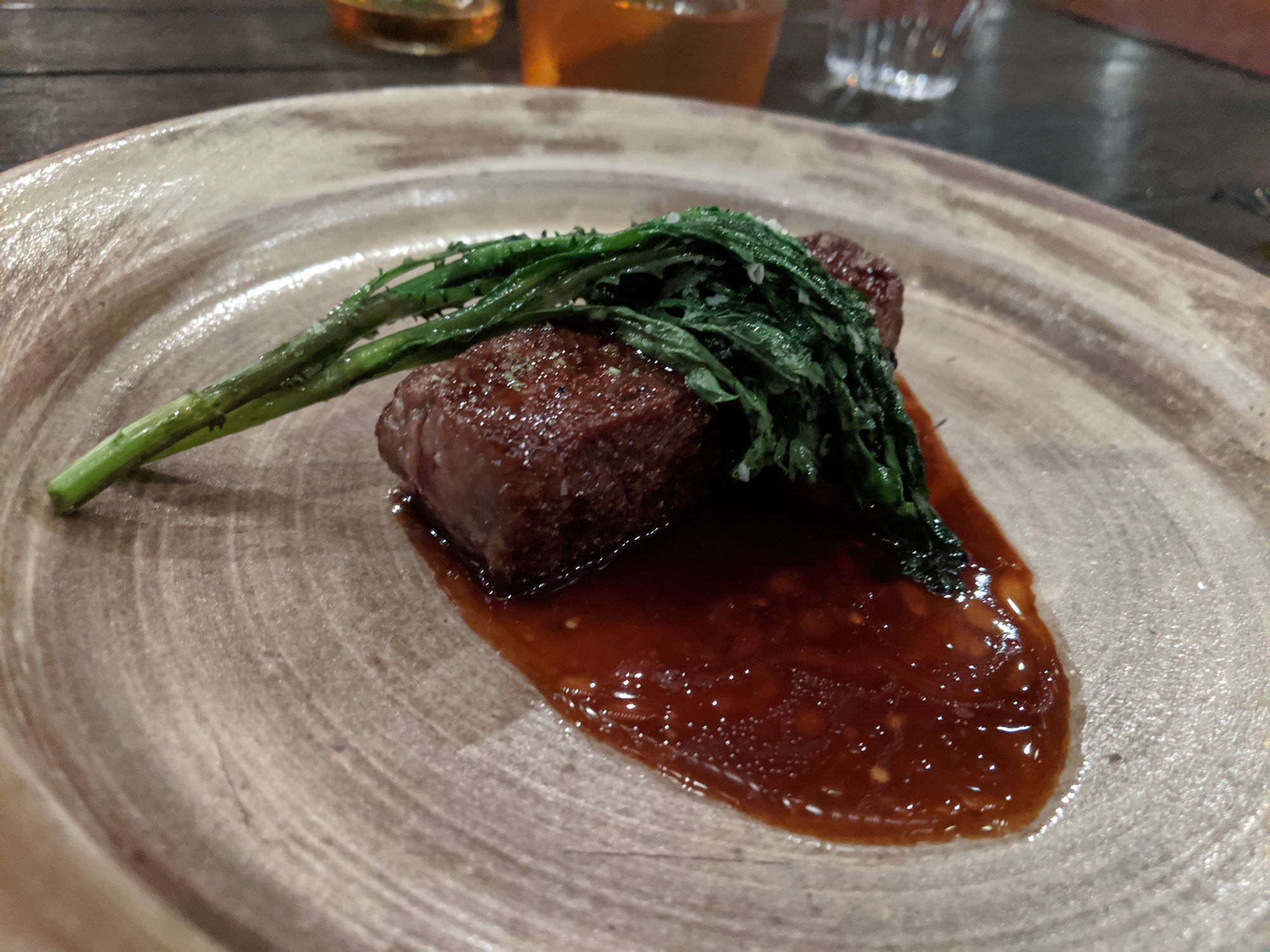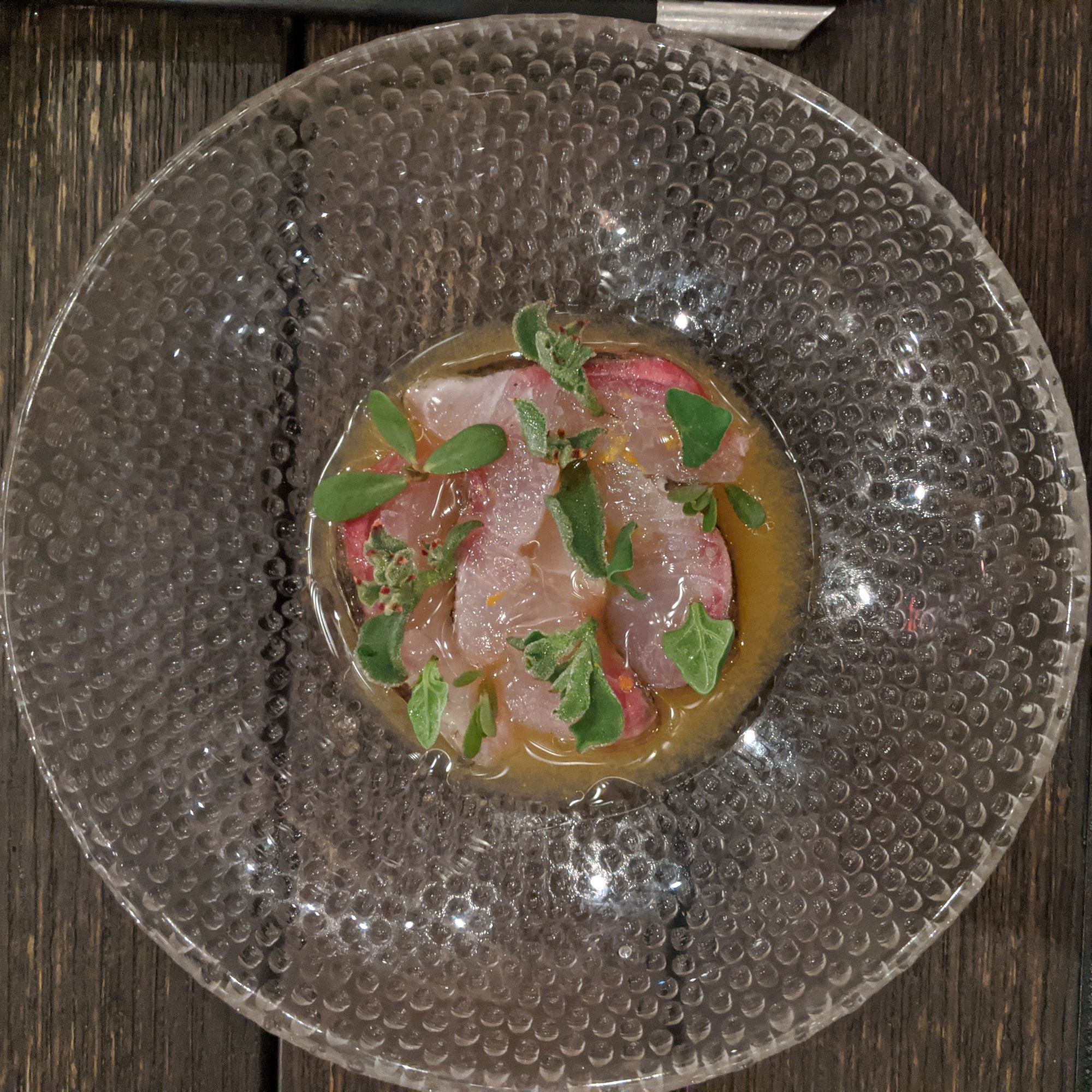 The amberjack dish was light, subtly smokey and refreshing. The passionfruit and succulent leaves added suprising complexity and textural contrast to a suprisingly simple dish.